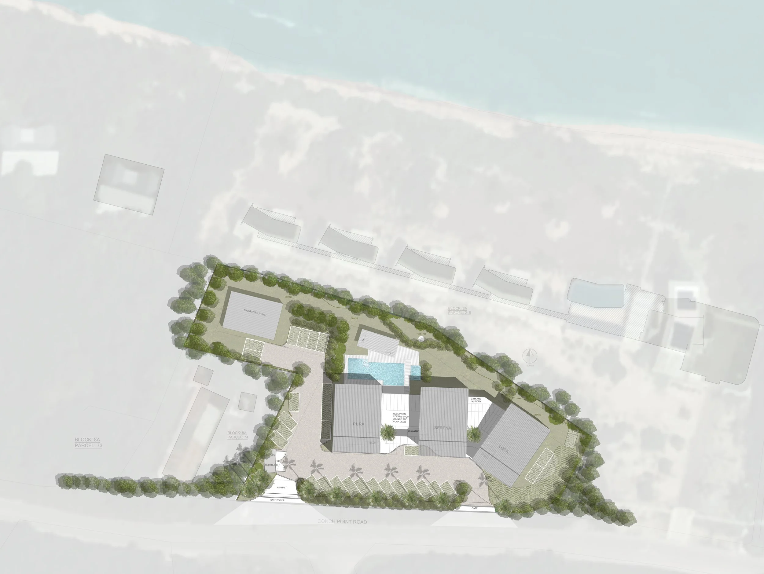 A unique collection of boutique ocean view villas on the shores of Barkers Beach. The design intent is to minimize the feel of a large footprint by opening throughout views from all spaces. The placement of the guest units primarily face the ocean, then to be in constant contact with the pool deck and outdoor living spaces.