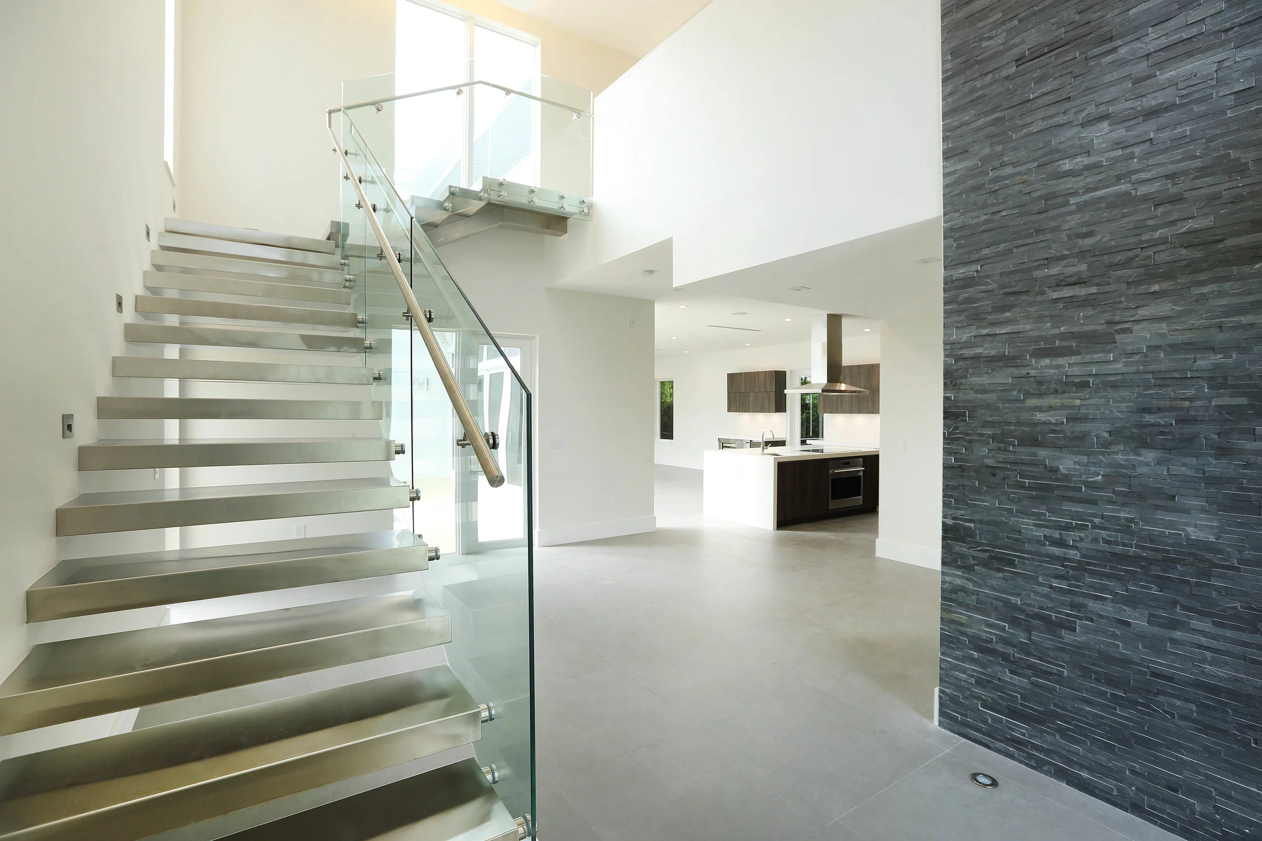 About the project: This two story house was designed on a long narrow site in a desirable area of 'North Grove'. The design revolves around a pool deck court facing Southwest. The client's request was to design a house that would contain all the spaces desired by a young family, and a flex space that could be treated as an outdoor social living room. The entry foyer is a double volume with an open tread, with a wood and glass staircase leading to the four bedrooms through a short corridor overlooking the pool area. The large living space gets integrated to the pool and the flex space for entertainment.